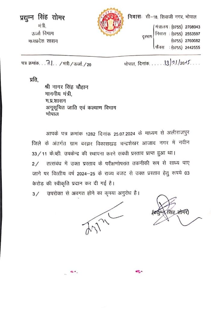 अलीराजपुर। विधायक और मध्यप्रदेश सरकार के कैबिनेट मंत्री नागर सिंह चौहान के अथक प्रयासों से जिले के आजाद नगर विकासखंड के ग्राम बरझर में नवीन 33 के.व्ही. उपकेन्द्र विद्युत ग्रीट की प्रशासनिक एवं वित्तीय स्वीकृति प्रदान कर दी गई है। जिसके चलते 3 करोड़ रुपए की स्वीकृति प्राप्त हुई है।इस संबंध में भाजपा जिलाध्यक्ष मकू परवाल ने बताया कि क्षेत्र के लोकप्रिय नेता कैबिनेट मंत्री नागर सिंह चौहान और सांसद श्रीमती अनिता चौहान ने बरझर क्षेत्र के रहवासियों की मांग पर वादा करते हुए आश्वस्त किया था कि भाजपा की सरकार हर आम व्यक्ति की सुविधाओं के लिए निरन्तर कार्यरत है। मंत्री श्री चौहान ने कई बैठकों में घोषणा करते हुए कहा था कि लोकसभा निर्वाचन के बाद बरझर क्षेत्र में विद्युतीकरण वोल्टेज आदि समस्याओं के स्थाई समाधान करते हुए विद्युत ग्रिट (उप केंद्र) की स्थापना की जाएगी। इस संबंध में कैबिनेट मंत्री श्री चौहान ने विद्युतीकरण को मजबूत करने के लिए ऊर्जा मंत्री प्रद्युम्न सिंह तोमर को पत्र क्रमांक 1282 दिनांक 25.07.2024 के माध्यम से अलीराजपुर जिले के अंतर्गत ग्राम बरझर विकासखंड चन्द्रशेखर आजाद नगर में नवीन 33/11 के.व्ही. उपकेन्द्र की स्थापना करने के लिए पत्र प्रेषित किया था। आपको बता दे कि मंत्री श्री चौहान के पत्र पर आज मध्यप्रदेश शासन के ऊर्जा मंत्री प्रद्युम्न सिंह तोमर ने कैबिनेट मंत्री नागरसिंह चौहान को पत्र प्रेषित करते हुए अवगत करवाया कि मंत्री श्री चौहान द्वारा प्रेषित प्रस्ताव के परीक्षणोपरांत तकनीकी रूप से साध्य पाए जाने पर वित्तीय वर्ष 2024-25 के राज्य बजट से उक्त प्रस्ताव हेतु रूपये 03 करोड़ की स्वीकृति प्रदान कर दी गई है।मंत्री श्री चौहान ने बताया कि हमारी भाजपा सरकार जो कहती है वह कर के दिखाती है। और हमारा लक्ष्य सिर्फ क्षेत्र का विकास और आम जन को सुविधा उपलब्ध करे है। आज मिली विद्युत ग्रिट की स्वीकृति से अब ग्राम बरझर में अब नवीन 33 केबी का एक क्षेत्र के अनुरूप अच्छा बड़ा विद्युत ग्रिट स्थापित होगा जिससे क्षेत्र में वोल्टेज संबंधित समस्या भी नहीं आएगी। ग्रिट के लिए बजट स्वीकृत होने पर बरझर क्षेत्र के लालसिंह चौहान, महेश भूरिया, शांतिलाल प्रजापत, विक्रम सहित कई कार्यकर्ताओं ने कैबिनेट मंत्री नागर सिंह चौहान एवं ऊर्जा मंत्री प्रद्युम्न सिंह तोमर का आभार व्यक्त करते हुए धन्यवाद ज्ञापित किया।