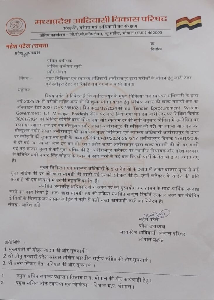 अलीराजपुर। जिला कांग्रेस कमेटी पूर्व अध्यक्ष एवं मप्र आदिवासी विकास परिषद उपाध्यक्ष महेश पटेल ने गुरवार को आयोजित पत्रकार वार्ता मे जिला चिकित्सालय मे मरीजों के भोजन मे हुई टेंडर प्रकिया ओर गड़बडी की जाँच की माँग कलेक्टर डॉ. बेडेकर से की हे । साथ ही उन्होंने जिला प्रशासन को चेतावनी देते हुवे कहा की अगर इस मामले मे कार्यवाही नहीं की गईं तो आगामी दिनों मे हजारों ग्रामीणो ओर आमजनों के साथ अस्पताल मे धरना-प्रदर्शन करेंगे ।श्री पटेल ने जानकारी देते हुवे बताया की जहाँ एक ओर प्रदेश की भाजपा सरकार स्वास्थ्य को लेकर बडे बडे दावे करती हे, मगर भाजपा नेता दलाली करते हुए मरीजों के भोजन पर भी डाका डालकर भ्रष्टाचार करने में लगे हुए हैं। वह मरीजों को भी नहीं छोड़ रहे हे, बाजार मूल्य से दुगना नहीं बल्कि तीन गुना राशि से बढ़कर रेट मे सप्लाई कर रहे हे। इस मामले मे मुख्य चिकित्सा एवं स्वास्थ्य अधिकारी, डीपीएम द्वारा वर्ष 2025-26 में मरीजों सहित अन्य को निः शुल्क भोजन प्रदाय हेत् विभिन्न प्रकार की खाद्य सामग्री क्रय का ऑनलाइन टेंडर 2024 DHS 388182-1 दिनांक 13/12/2024 को mp Tendar Eprocurement SystemGovermment of Madhya Pradesh पोर्टल पर जारी किया गया था। इस जारी टेंडर पर निविदा दिनांक 06/01/2024 को निविदा समिति द्वारा खोला गया ओर न्यूनतम दर की सूची अनुसार निविदा में उल्लेखित दरदाता मां ज्वाला आल इन वन सोल्यूशन इंदौर शाखा अलीराजपुर की स्वीकृत की गई। माँ ज्वाला आल इन वनसोल्यूशन इंदौर शाखा अलीराजपुर को कार्यालय मुख्य चिकित्सा एवं स्वास्थ्य अधिकारी अलीराजपुर द्वारा दर स्वीकृति की सूचना मय सूची के क्रमांक/निविदा/स्टोर/2024-25 /317 अलीराजपुर दिनांक 17/01/2025 से दी गई। मां ज्वाला आल इन वन सोल्यूशन इंदौर शाखा अलीराजपुर द्वारा खाद्य सामग्री की जो दर डाली गई वह बाजार मूल्य से तीन गुना अधिक की है। श्री पटेल ने बताया की अलीराजपुर कलेक्टर स्थानीय विधायक व केबिनेट मंत्री के दबाव में कार्य करने के कई बार विपक्षी पार्टी के नेताओं द्वारा लगाए गए हे, मुख्य चिकित्सा एवं स्वास्थ्य अधिकारी द्वारा नेताओं के दबाव में आकर बाजार मूल्य से कई गुना अधिक की दर जो खाद्य सामग्री की डाली गई उसको स्वीकृत की है। इसमें कलेक्टर के आदेश की प्रति सलंगन है, जो इस धांधली में उनकी सहमति दर्शाता हैं। उन्होंने बताया की इस संबंध मे मप्र मुख्यमंत्री, प्रदेश कांग्रेस अध्यक्ष, मप्र नेता प्रतिपक्ष, स्वास्थ्य विभाग के प्रदेश सचिव ओर इंदौर संभाग पुलिस कमीशनर को शिकायत पत्र की प्रतिलिपि भेजी हे। श्री पटेल ने कहा की संबंधित जवाबदेह अधिकारियों ने अपने पद का दुरुपयोग कर शासन के साथ आर्थिक अपराध करने का कार्य किया है। उन्होंने कलेक्टर से खाद्य सामग्री क्रय की प्रक्रिया संबंधित सम्पूर्ण रिकॉर्ड तत्काल ज