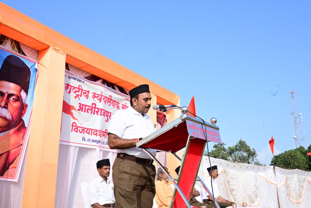 आलीराजपुर। राष्ट्रीय स्वयंसेवक संघ के 100 वर्ष पूर्ण होने पर रविवार को विजयादशमी उत्सव के निमित्त शताब्दी वर्ष का पथसंचलन नगर में बड़े उत्साह के साथ निकाला गया। नगरवासियों ने पुष्पवर्षा कर विभिन्न स्थानों पर स्वयंसेवकों का स्वागत किया। यह पथसंचलन फतेह क्लब मैदान से प्रारंभ होकर नगर के प्रमुख मार्गों से होते हुए पुनः वहीं समाप्त हुआ। बौद्धिक कार्यक्रम और अतिथियों के उद्बोधनकार्यक्रम के पूर्व बौद्धिक सत्र आयोजित हुआ, जिसमें मंच पर मुख्य अतिथि जितेंद्र जी कोठारी (समाजसेवी), विशेष अतिथि चंदरसिंह जी चौहान (भगत जी), जिला संघचालक नानसिंह जी धाकड़, खंड संघचालक भुवन जी भंवर तथा मुख्य वक्ता प्रांत जनजाति कार्य प्रमुख कैलाश जी अमलियार मंचासीन रहे।