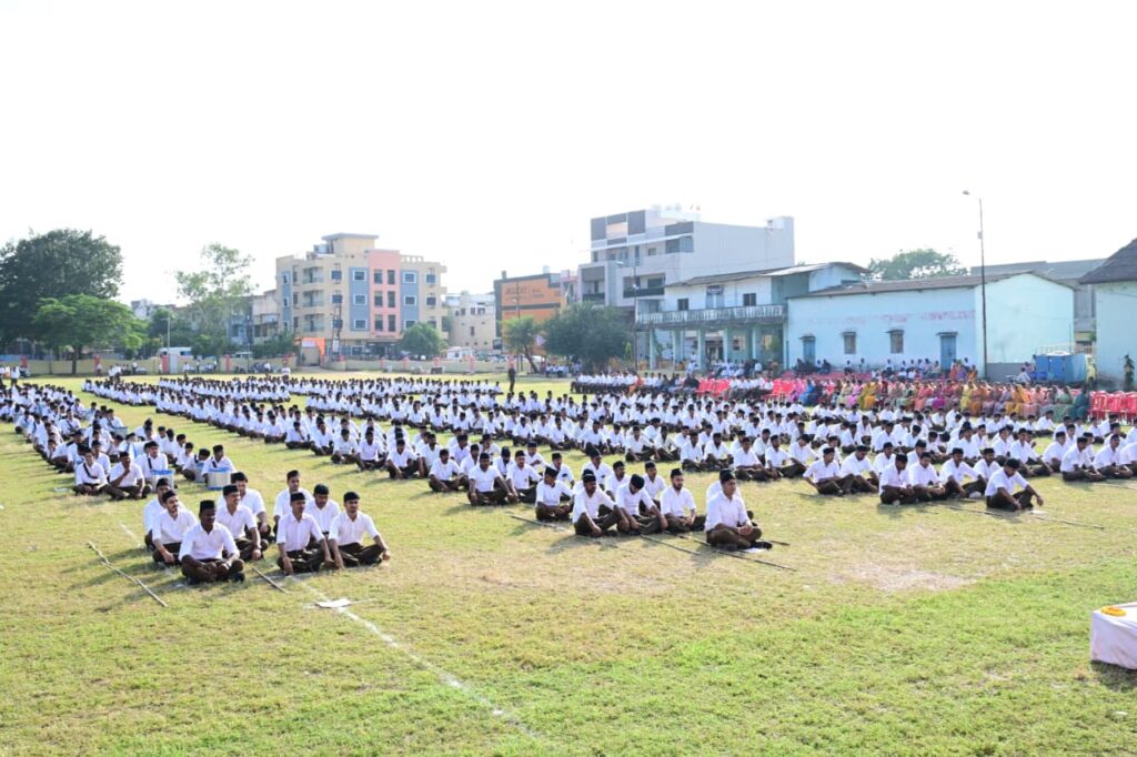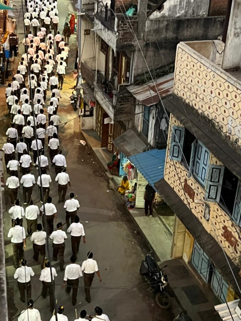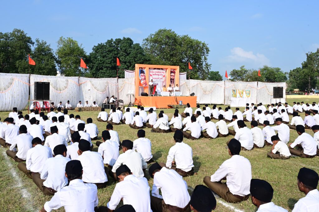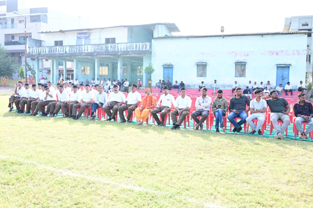 उन्होंने कहा कि “इन पाँच बिंदुओं पर कार्य कर ही हम अपने राष्ट्र को सम्पन्न और सशक्त बना सकते हैं।”—पथसंचलन का समापनबौद्धिक के पश्चात घोष की धुन पर स्वयंसेवक कदमताल करते हुए नगर भ्रमण पर निकले। मातृशक्ति और समाजबंधुओं ने पुष्पवर्षा व जयघोष के साथ स्वागत किया।कार्यक्रम में योगासन, एकल गीत, अमृत वचन, प्रार्थना और आकर्षक रंगोली प्रदर्शन भी हुआ।कार्यक्रम का आभार नगर कार्यवाह श्री श्रवण जी गुप्ता ने व्यक्त किया।
