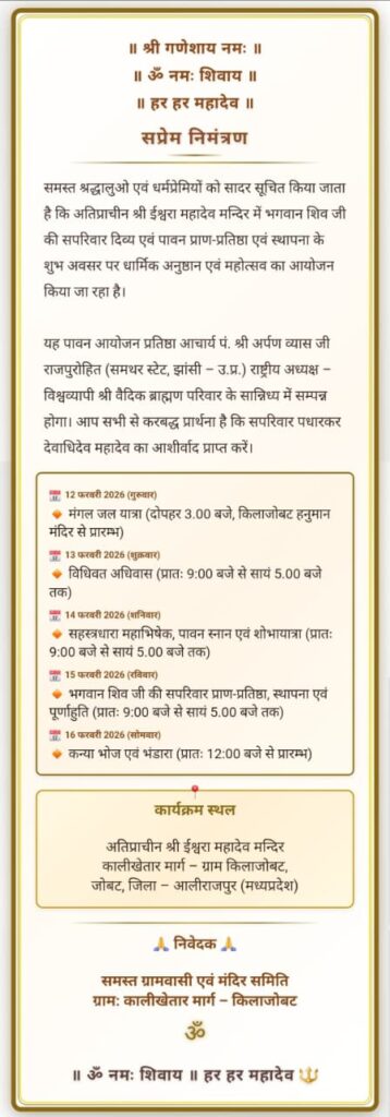 आयोजन समिति के अनुसार 13 फरवरी को विधिवत अधिवास, 14 फरवरी को सहस्त्रधारा महाभिषेक, पावन स्नान एवं शोभायात्रा, 15 फरवरी को भगवान शिव जी की सपरिवार प्राण-प्रतिष्ठा, स्थापना एवं महाआरती तथा 16 फरवरी को कन्या भोज एवं विशाल भंडारे का आयोजन किया जाएगा।कार्यक्रम स्थल अतिप्राचीन श्री ईश्वरा महादेव मंदिर, कालीखेतार मार्ग, ग्राम किलाजोबट, जोबट, जिला आलीराजपुर (म.प्र.) है। आयोजन समस्त ग्रामवासी एवं मंदिर समिति द्वारा किया जा रहा है। समिति ने श्रद्धालुओं से अधिक से अधिक संख्या में शामिल होकर आयोजन को सफल बनाने की अपील की है।